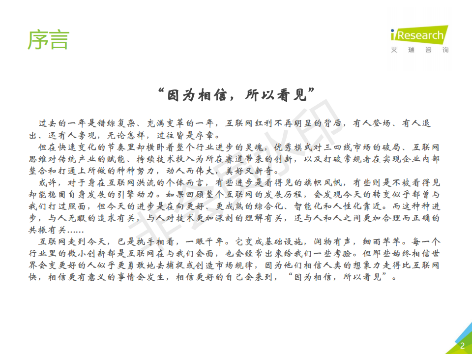 《潤物有聲III -2019中國互聯(lián)網(wǎng)發(fā)展全瞻》是艾瑞咨詢第三年度發(fā)布的綜合型報告,本報告對2018年的互聯(lián)網(wǎng),涵蓋營銷、文娛、金融、電商、旅游、人工智能等熱門行業(yè)進(jìn)行了觀點(diǎn)總結(jié)和趨勢預(yù)測,同時還有各行業(yè)新經(jīng)濟(jì)數(shù)據(jù)發(fā)布。在此基礎(chǔ)上,希望能夠幫助產(chǎn)業(yè)各方更深入的了解互聯(lián)網(wǎng)和應(yīng)對未來。