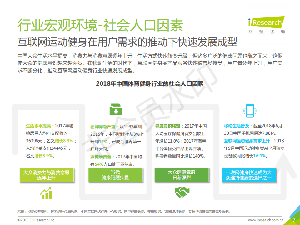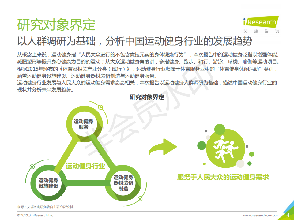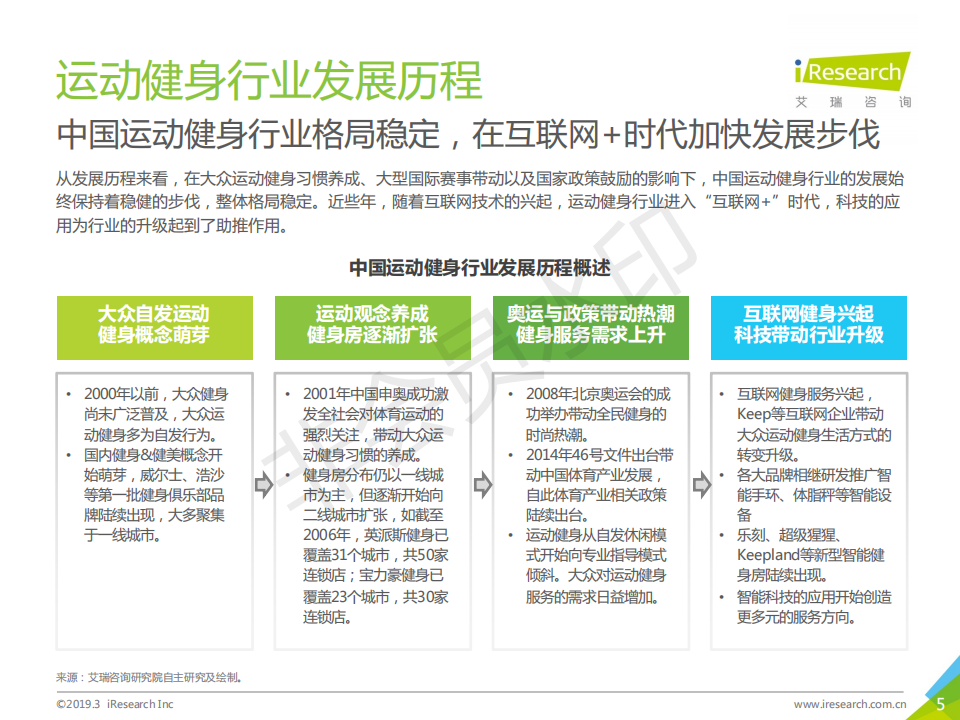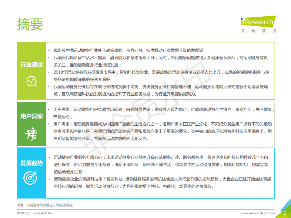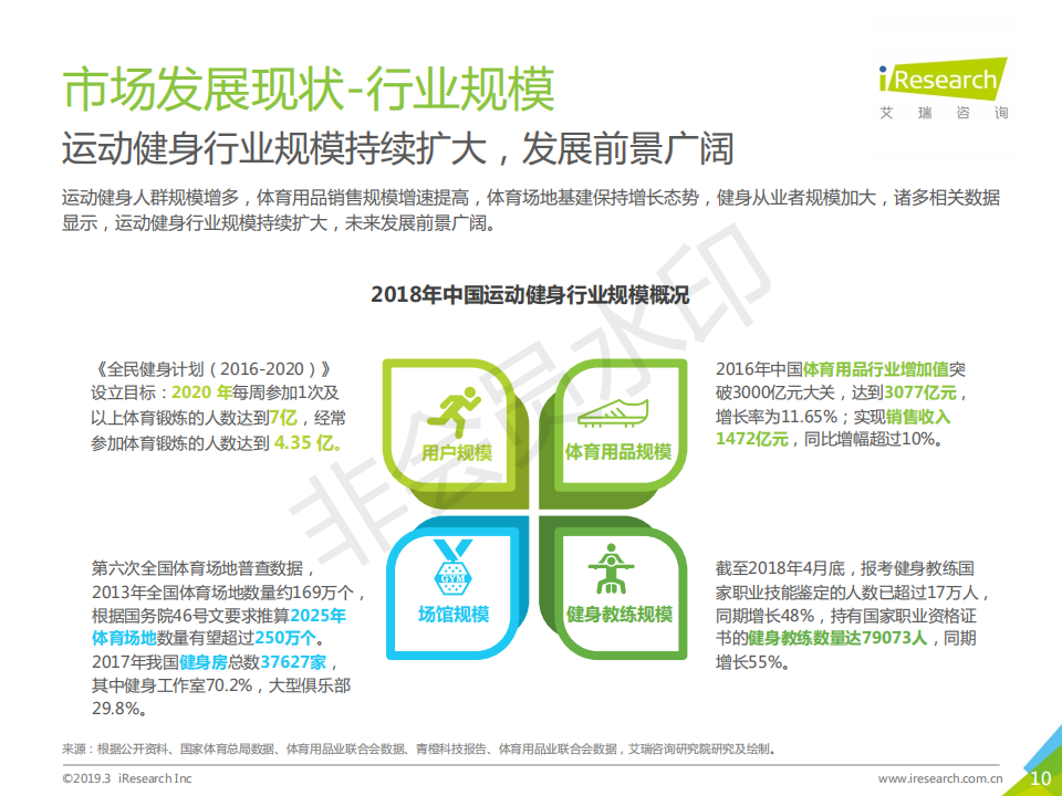 運動健身行業(yè)在政策鼓勵,大眾生活水平提升,健康意識提高的背景下,整體發(fā)展向好。2018年,傳統(tǒng)健身企業(yè)發(fā)展相對穩(wěn)定,資本看好穩(wěn)健型運動健身企業(yè)以及結合智能科技元素的新型運動健身企業(yè)。本報告以運動健身行業(yè)作為主要研究對象,描述并探討運動健身行業(yè)發(fā)展背景、現(xiàn)狀特點、產(chǎn)業(yè)鏈、商業(yè)模式,通過對運動健身人群的深入調(diào)研,探索其對運動健身場景、服裝設備、課程服務的服務需求,為未來行業(yè)服務升級提供發(fā)展建議。