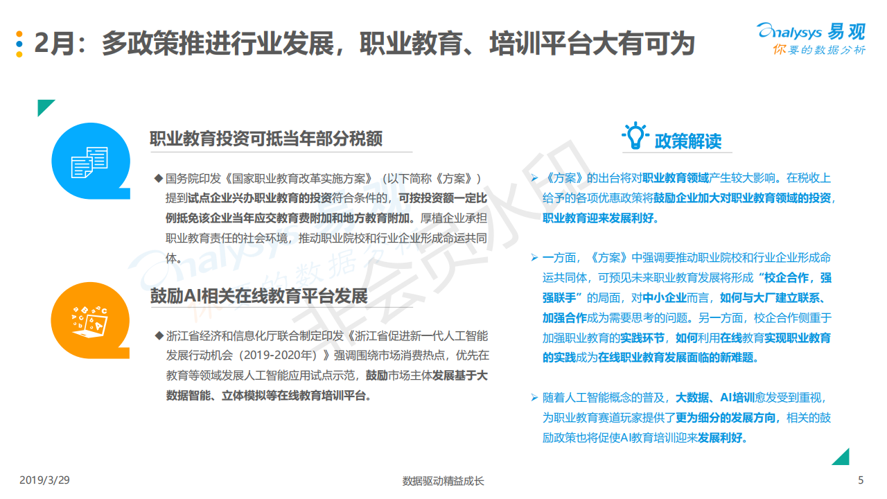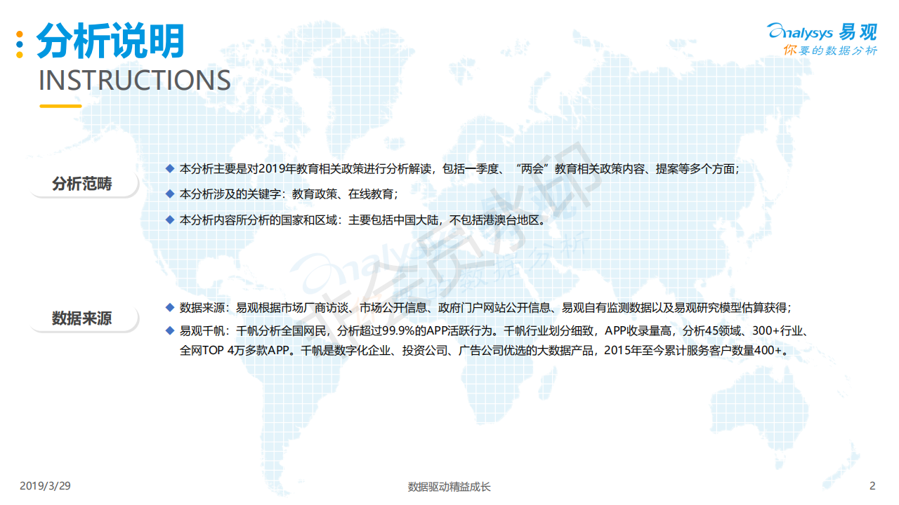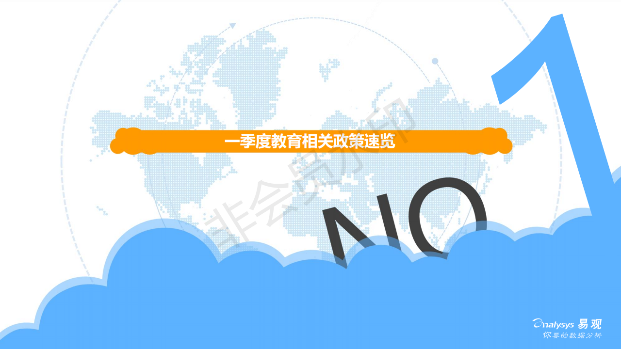 2019年3月29日,易觀發布了《互聯網教育行業政策風向解讀》分析報告。本分析主要是對教育相關政策進行分析解讀,包括Q1、“兩會”教育相關政策內容、提案等多個方面。