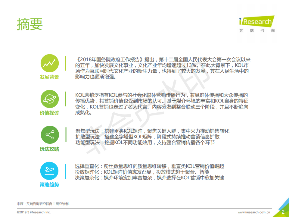 《中國KOL營銷策略白皮書》對KOL營銷的概念范疇、發(fā)展歷程、特征和營銷價值進行了梳理,重點挖掘了其在執(zhí)行層面上的營銷策略,包括KOL選擇、媒介選擇等策略,并梳理了三種典型的玩法。同時,也對KOL營銷在策略層面的發(fā)展趨勢進行了展望,旨在幫助廣告主更好地認(rèn)識KOL營銷的價值和策略方法。
