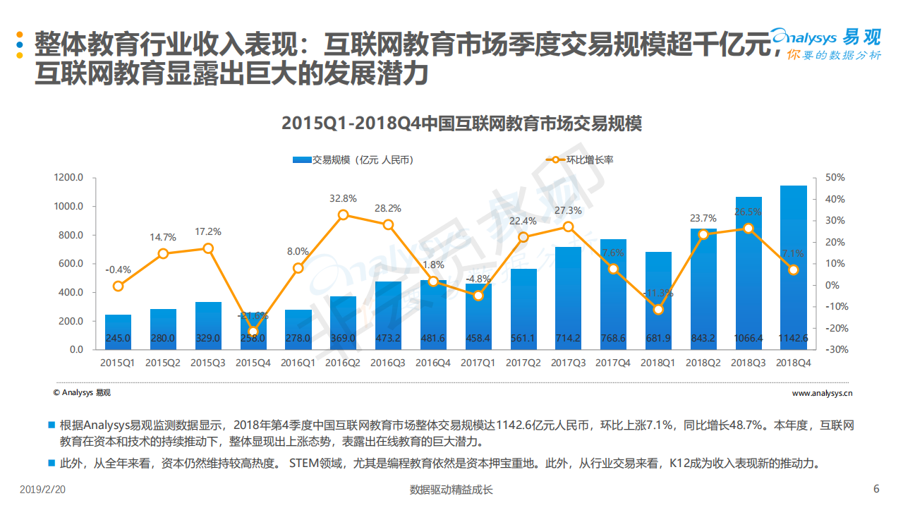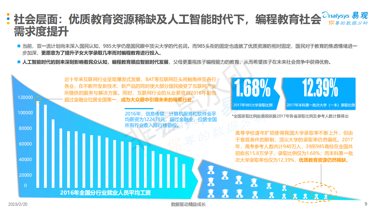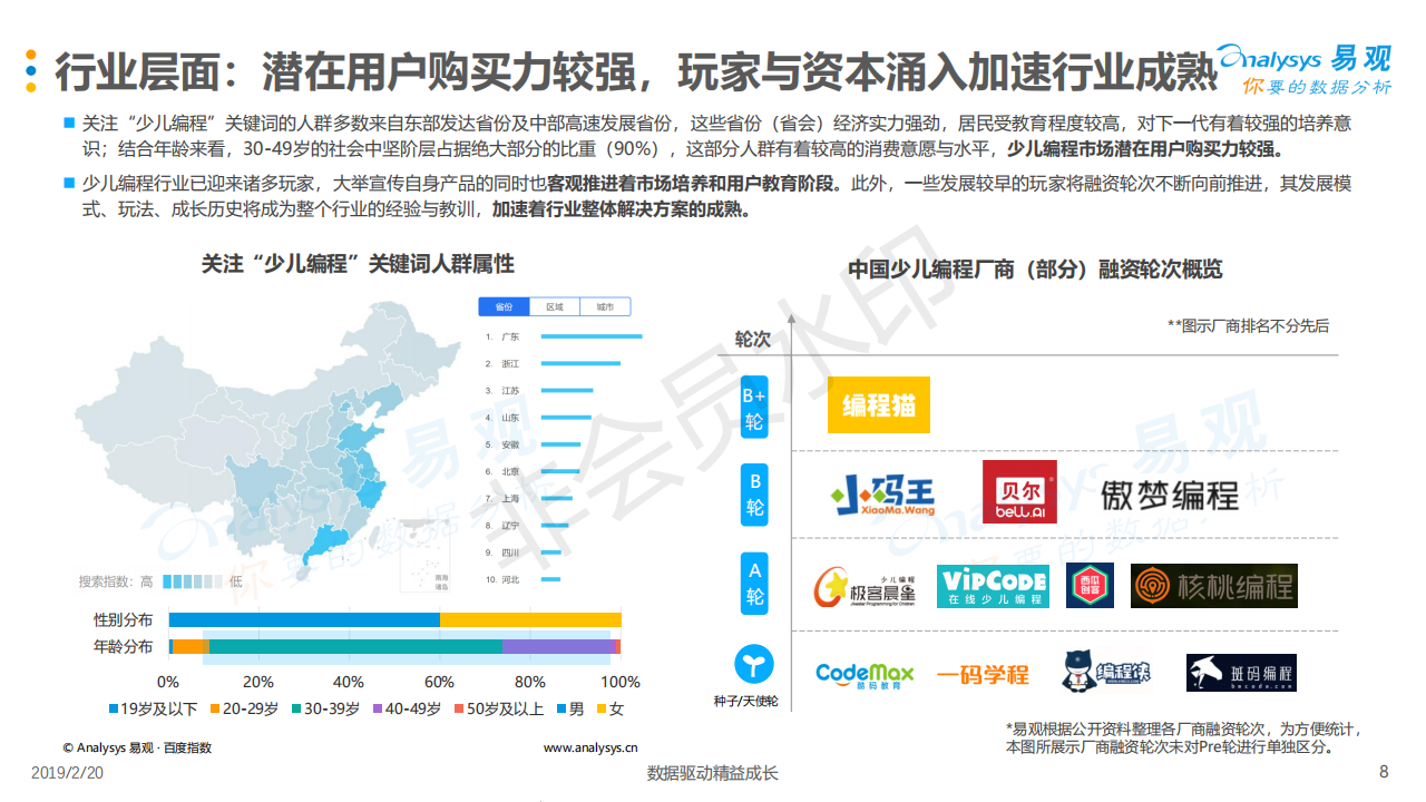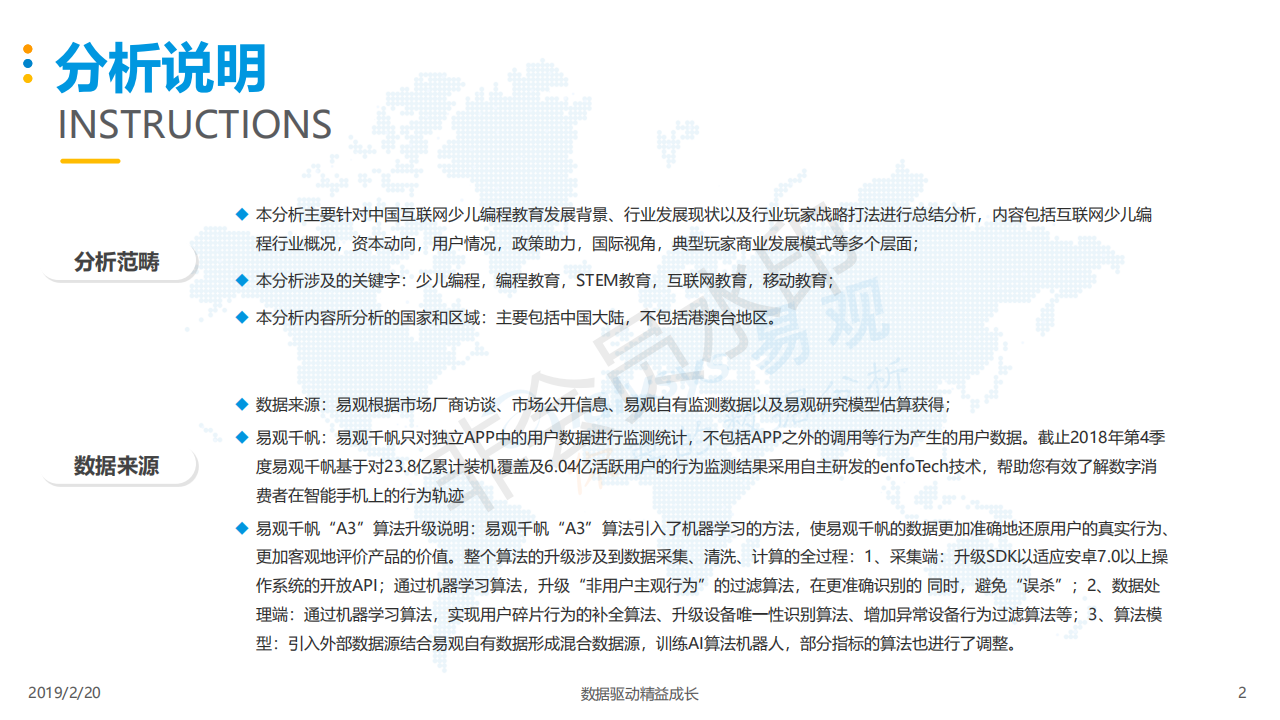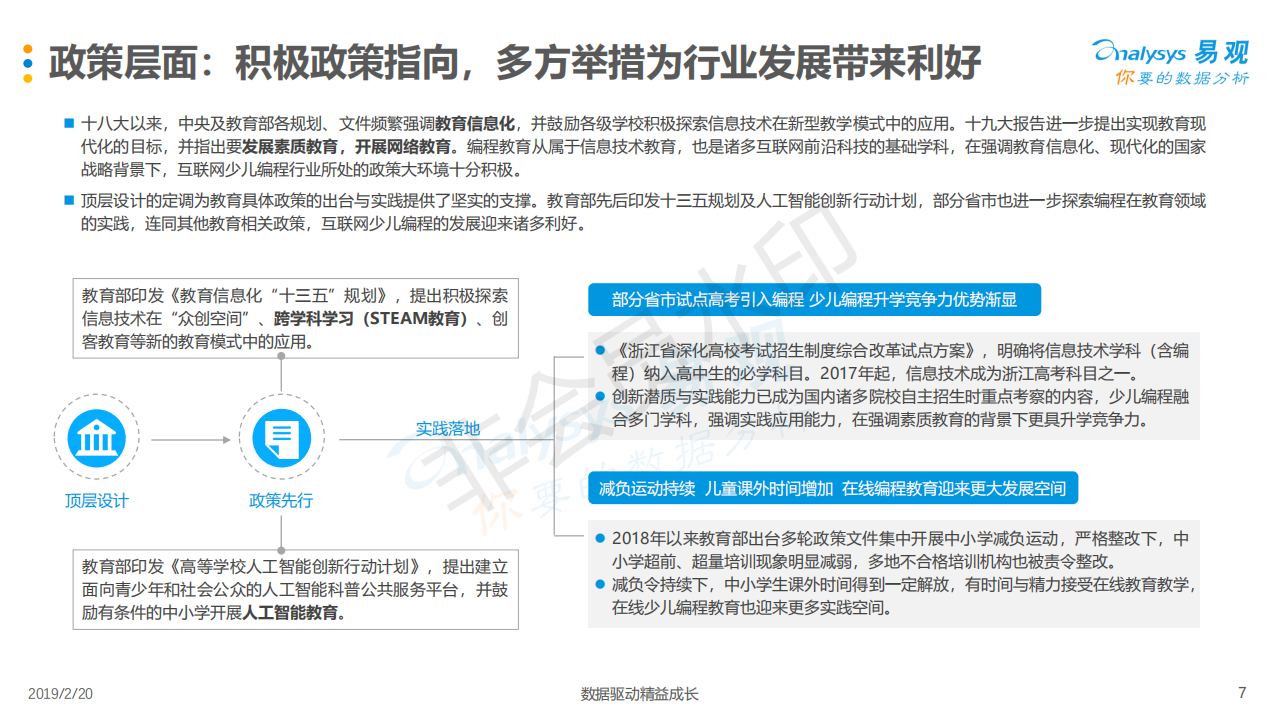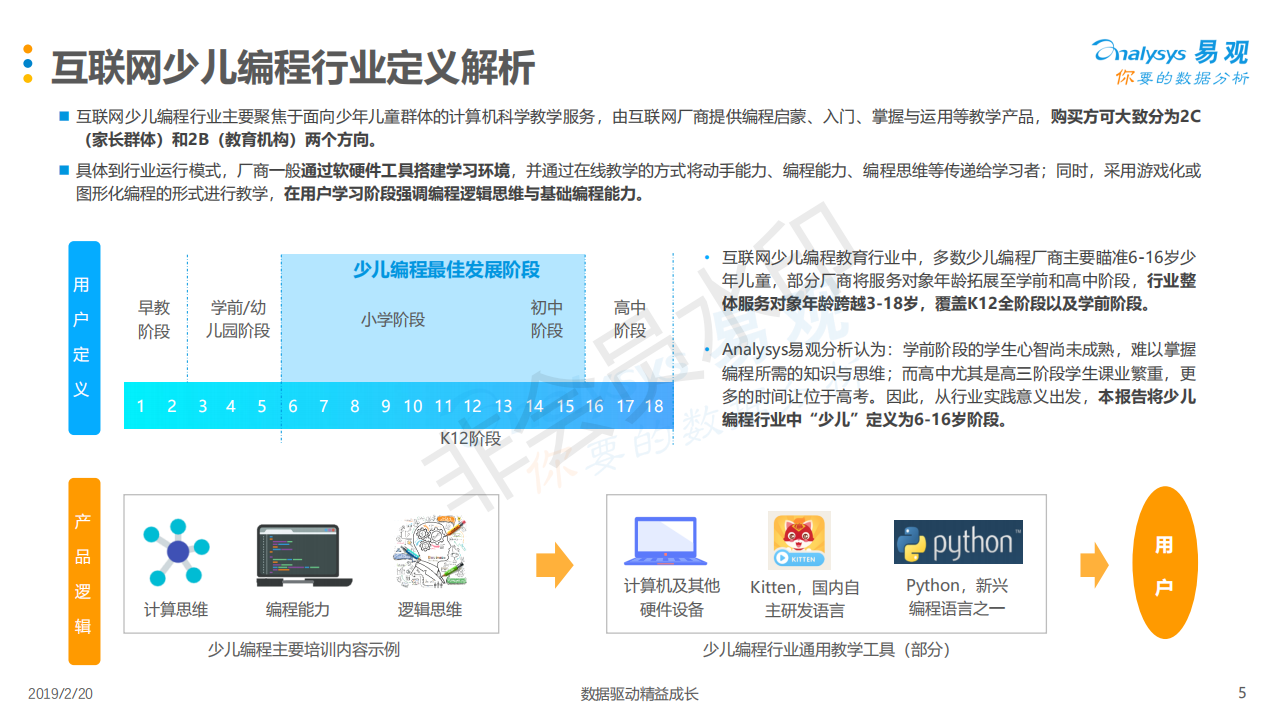 2019年2月20日,易觀發布了《中國互聯網少兒編程教育市場分析2019》的專題分析。本分析主要針對中國互聯網少兒編程教育發展背景、行業發展現狀以及行業玩家戰略打法進行總結分析,內容包括互聯網少兒編程行業概況,資本動向,用戶情況,政策助力,國際視角,典型玩家商業發展模式等多個層面。