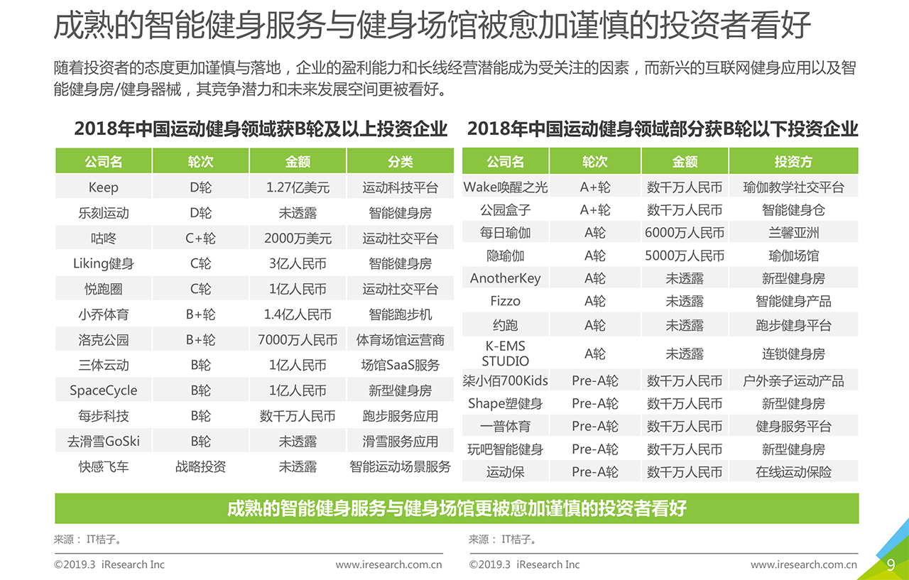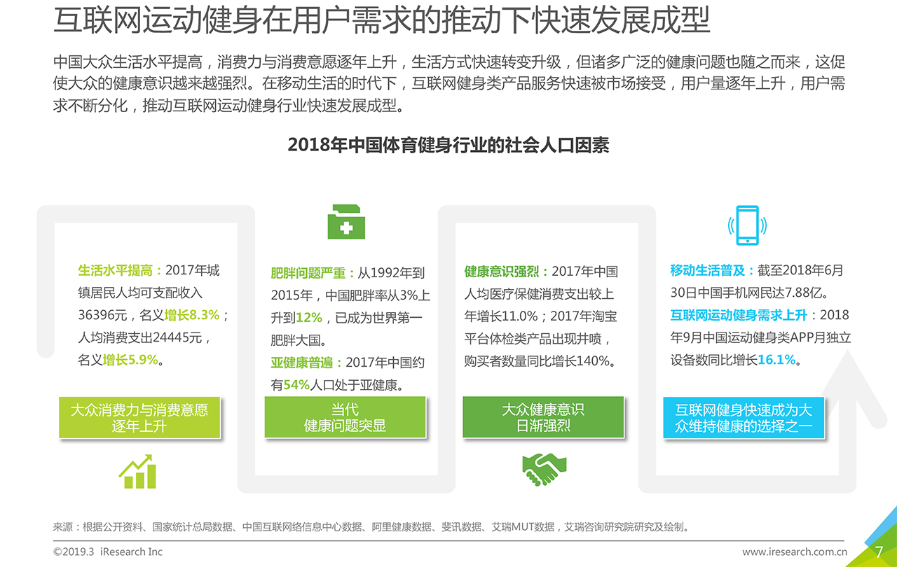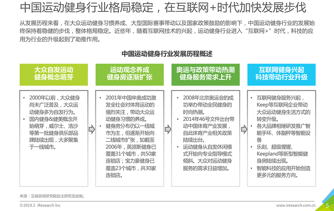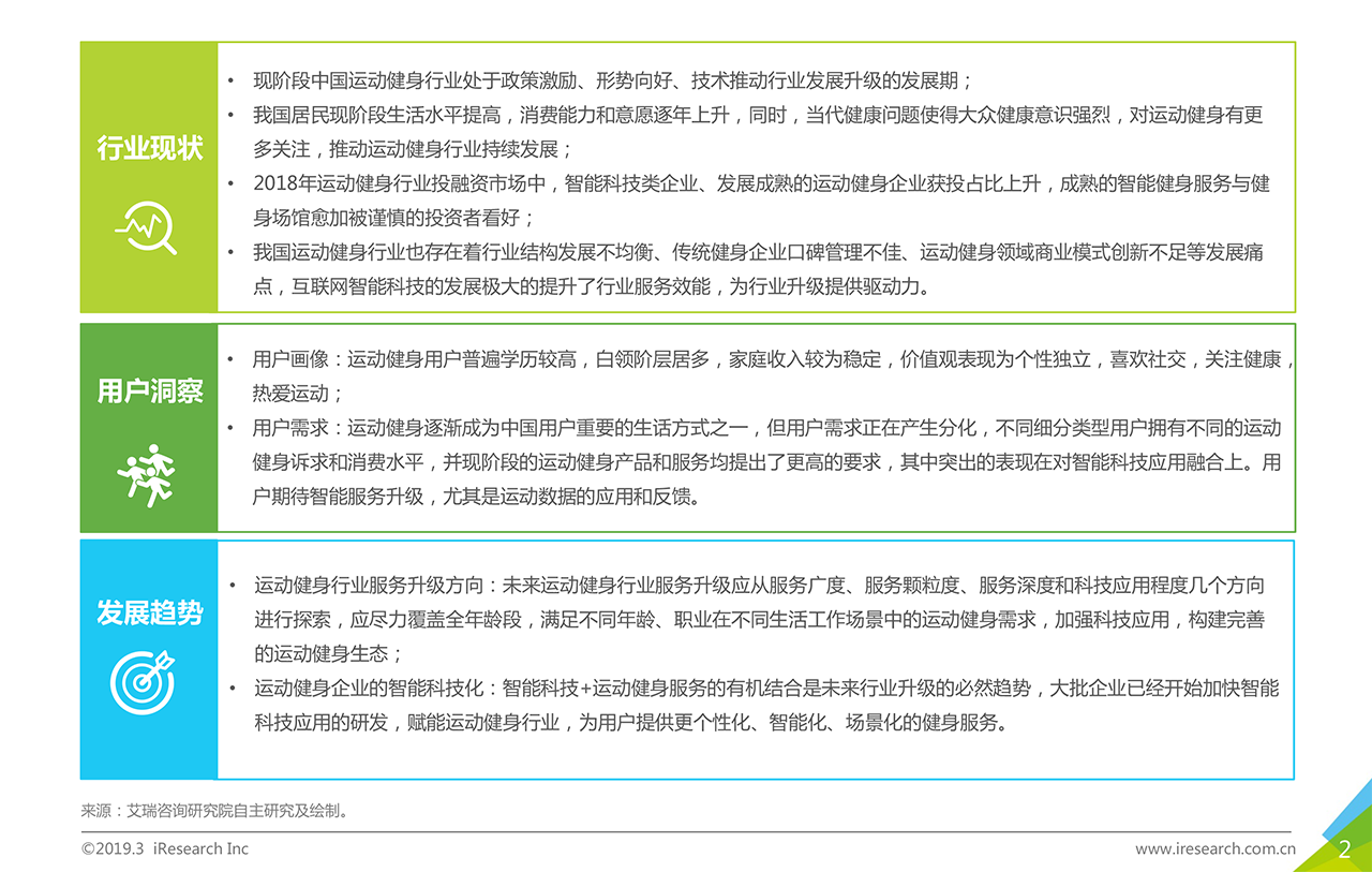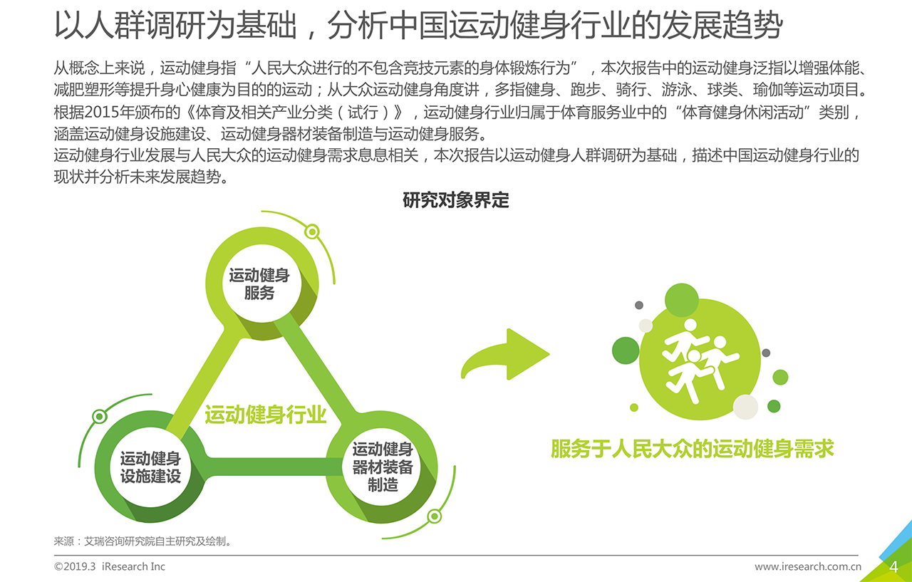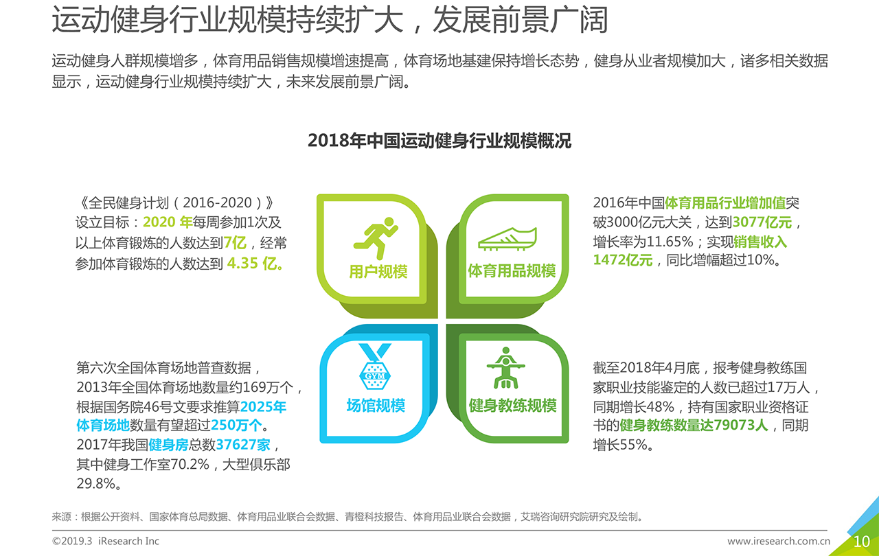 報告下載? ?運動健身行業(yè)在政策鼓勵,大眾生活水平提升,健康意識提高的背景下,整體發(fā)展向好。2018年,傳統(tǒng)健身企業(yè)發(fā)展相對穩(wěn)定,資本看好穩(wěn)健型運動健身企業(yè)以及結(jié)合智能科技元素的新型運動健身企業(yè)。本報告以運動健身行業(yè)作為主要研究對象,描述并探討運動健身行業(yè)發(fā)展背景、現(xiàn)狀特點、產(chǎn)業(yè)鏈、商業(yè)模式,通過對運動健身人群的深入調(diào)研,探索其對運動健身場景、服裝設備、課程服務的服務需求,為未來行業(yè)服務升級提供發(fā)展建議。