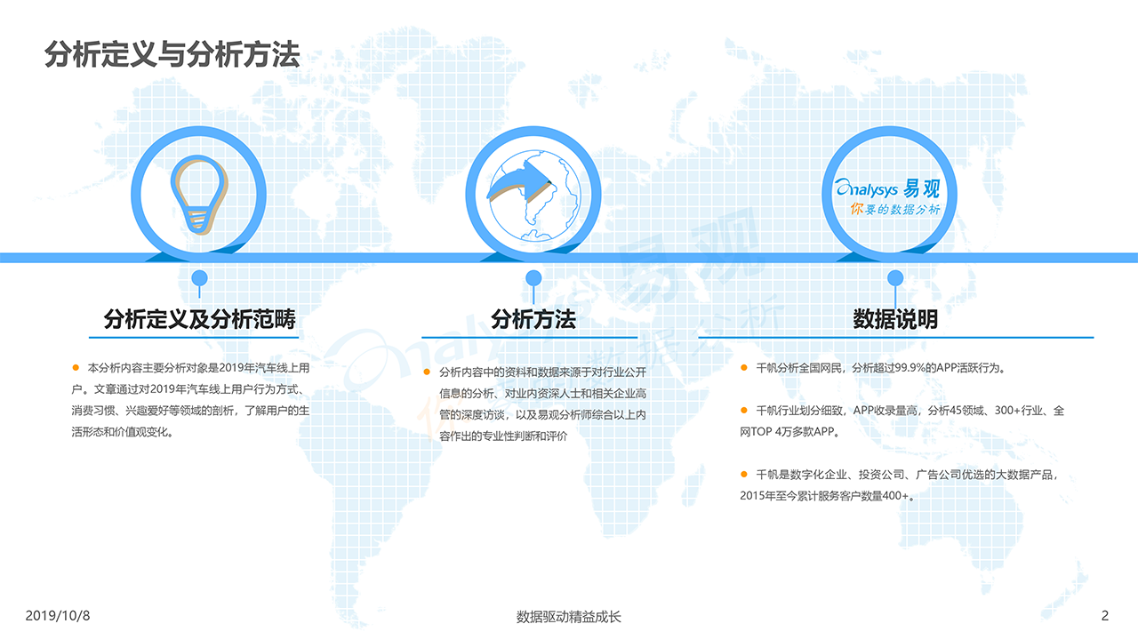 本分析內容主要分析對象是2019年汽車線上用戶。文章通過對2019年汽車線上用戶行為方式、消費習慣、興趣愛好等領域的剖析,了解用戶的生活形態和價值觀變化。