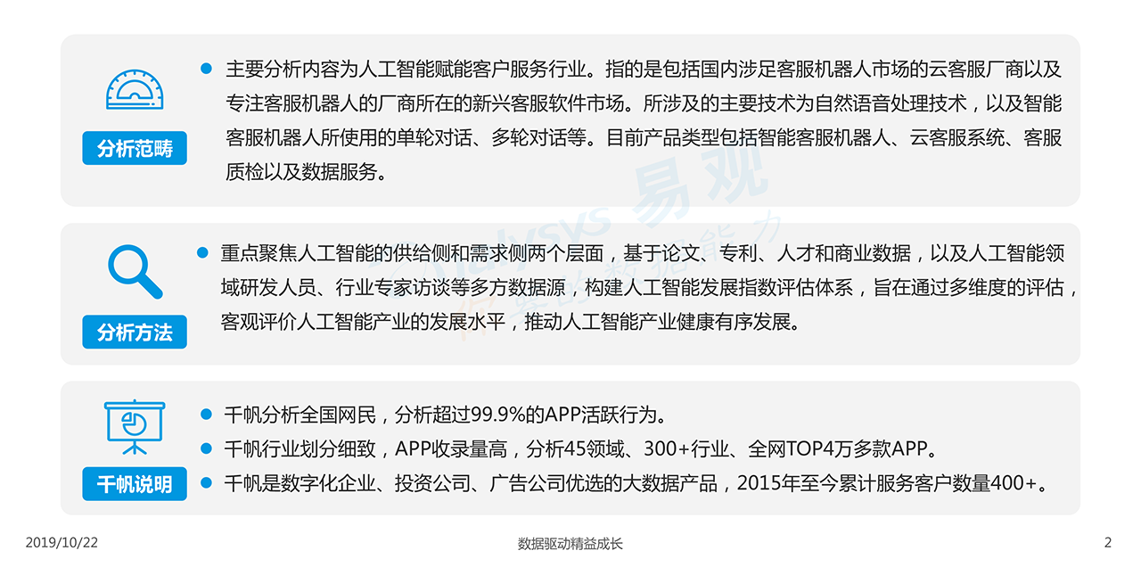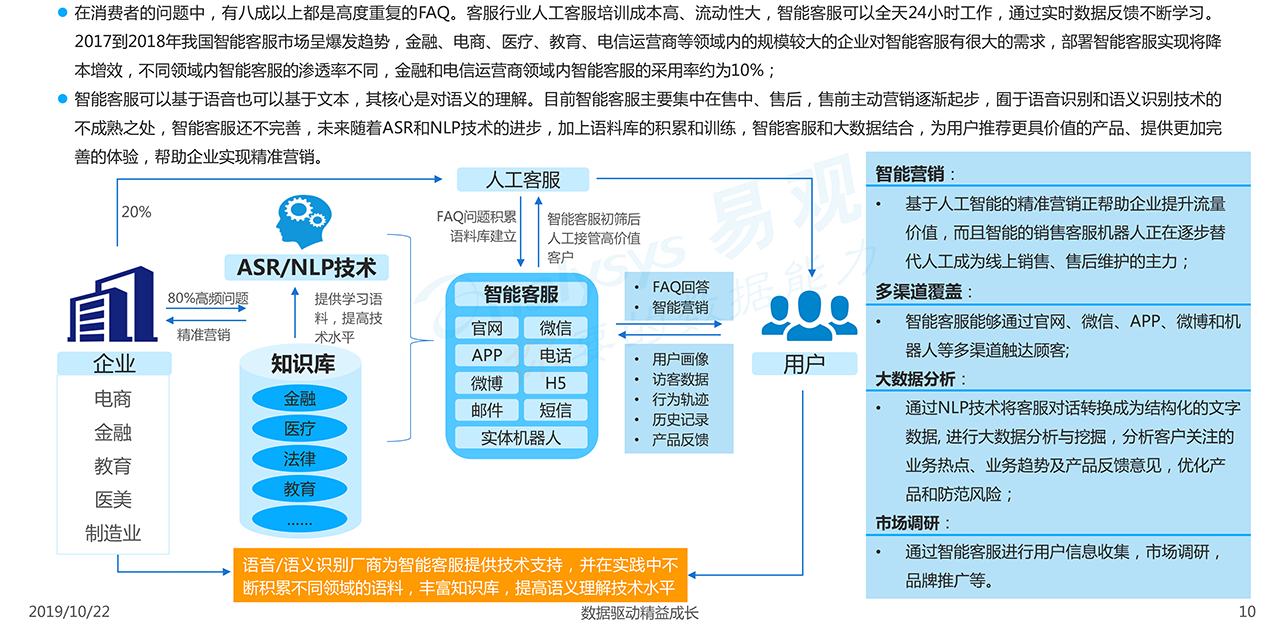 報(bào)告下載2019年10月18日,易觀發(fā)布了《中國(guó)客戶服務(wù)智能化市場(chǎng)專題分析2019》的專題分析,客戶服務(wù)作為企業(yè)提升用戶體驗(yàn)的“窗口”一直存在效率低下,服務(wù)單一等問(wèn)題,智能語(yǔ)音技術(shù)的發(fā)展使得部分人工客服的工作得以機(jī)器化和智能化,降低企業(yè)客戶服務(wù)成本,但仍然存在客戶體驗(yàn)差、缺乏差異化等問(wèn)題。隨著人工智能技術(shù)的持續(xù)深化以及客戶服務(wù)數(shù)據(jù)的不斷積累,智能客服市場(chǎng)由單純的人力替代向體驗(yàn)優(yōu)化、流程優(yōu)化等后端環(huán)節(jié)延伸。 研究?jī)?nèi)容:客戶服務(wù)智能化指的是云通訊、大數(shù)據(jù)、人工智能技術(shù)在商業(yè)場(chǎng)景下的應(yīng)用,包括智能客服、客服輔助、客戶運(yùn)維等,人工智能的主要價(jià)值在于替代客戶服務(wù)場(chǎng)景下的重復(fù)性工作,并優(yōu)化客戶體驗(yàn)。本報(bào)告對(duì)中國(guó)客戶服務(wù)智能化場(chǎng)景下各類應(yīng)用及其市場(chǎng)發(fā)展情況進(jìn)行評(píng)價(jià),并舉出典型廠商,從技術(shù)、服務(wù)能力等層面進(jìn)行評(píng)價(jià),呼應(yīng)行業(yè)發(fā)展特點(diǎn)和趨勢(shì)。
