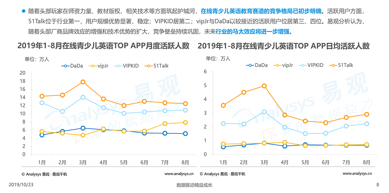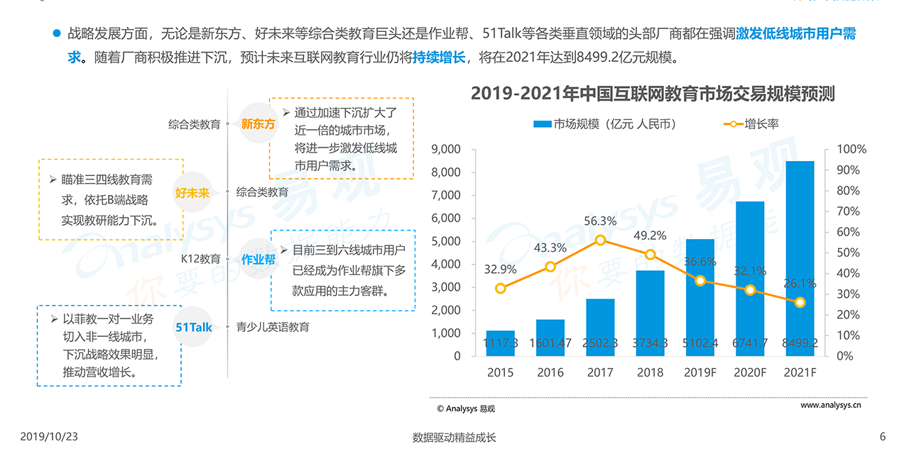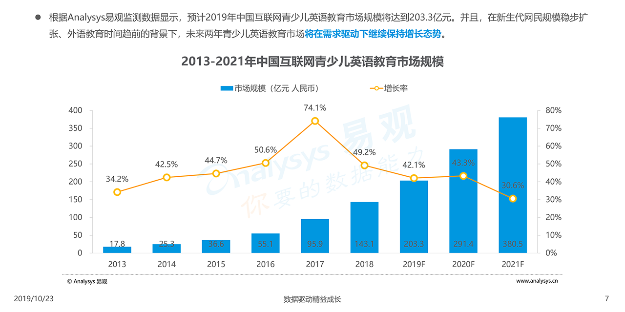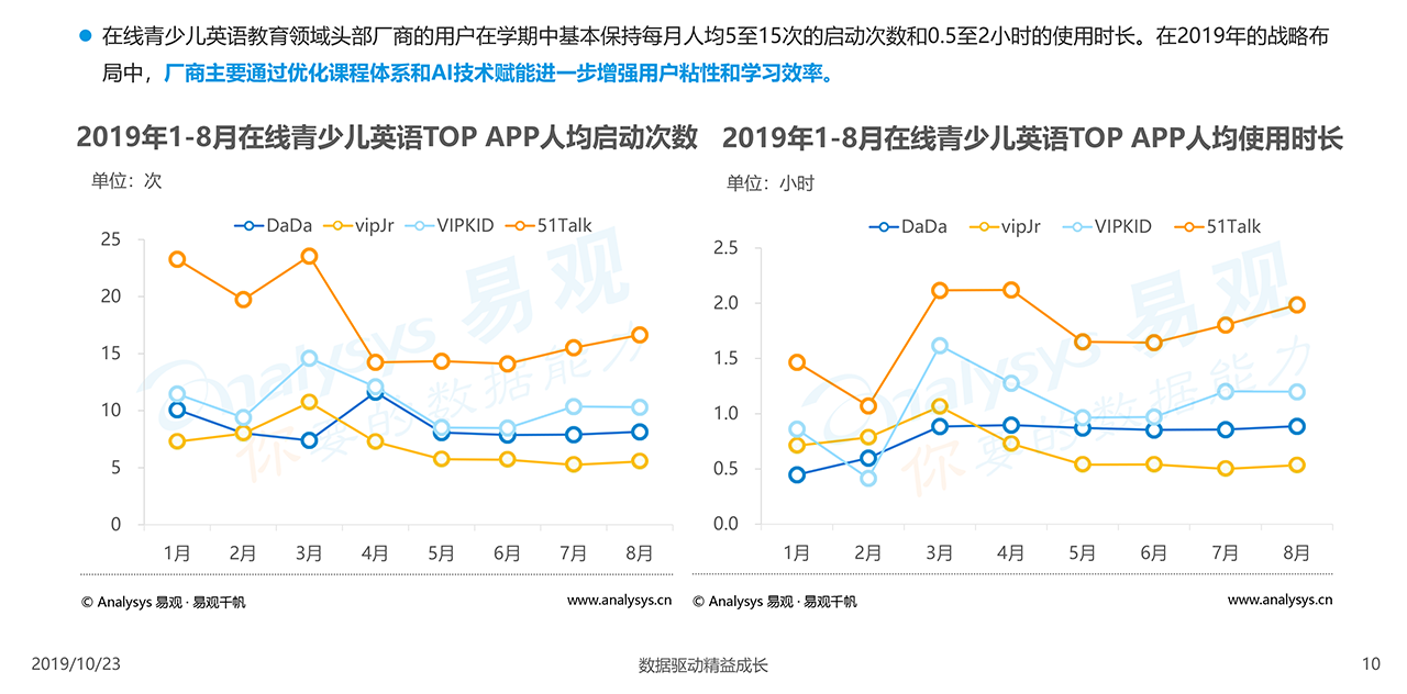 報告下載2019年10月23日,易觀發布了《中國互聯網青少兒英語教育行業洞察2019》的專題分析。青少兒英語教育行業在強需求驅動下保持著快速、穩定的增長,用戶流量加速向以51Talk為代表的頭部教育品牌集中。打造外教名師、引進正版教材、深耕課程體系……頭部廠商們圍繞各個維度積極鞏固競爭優勢,進入下半場的青少兒英語教育行業也呈現出更多新特點;未來,AI與大數據技術所驅動的自適應教育、市場下沉帶來的用戶紅利將成為行業新一輪增長的核心引擎。