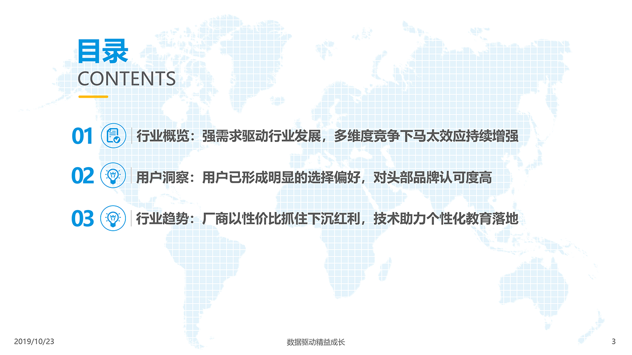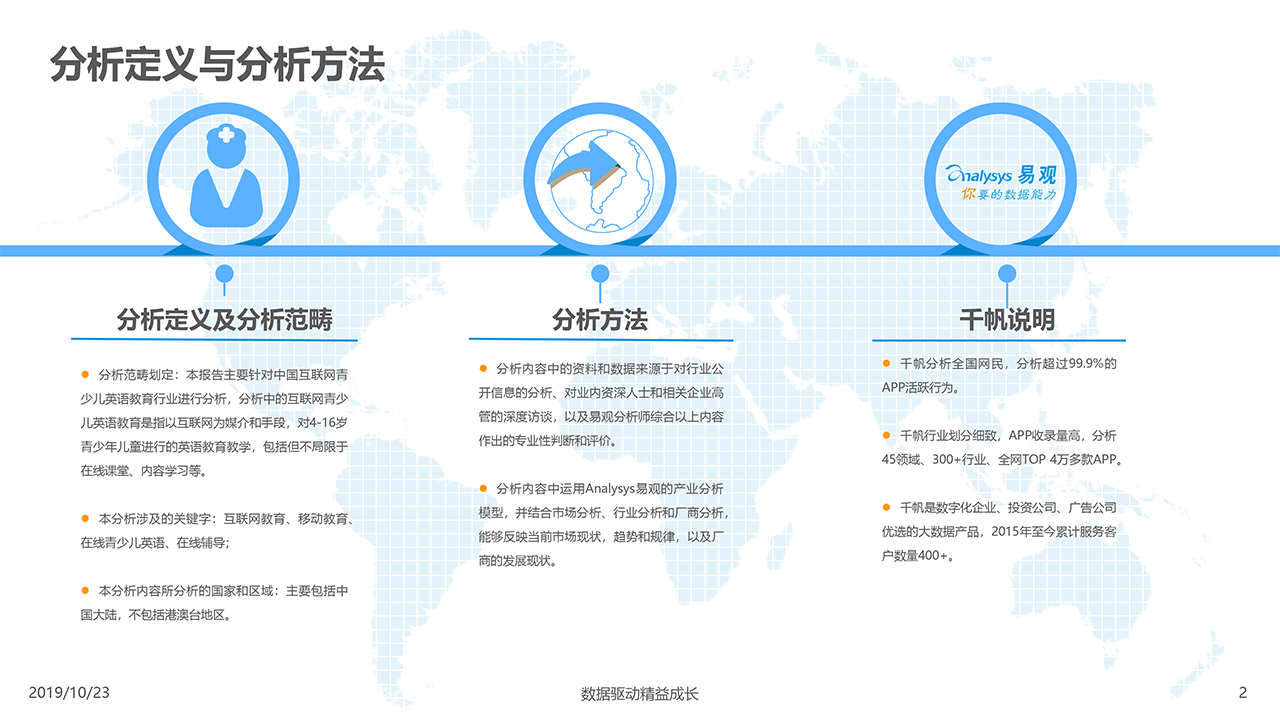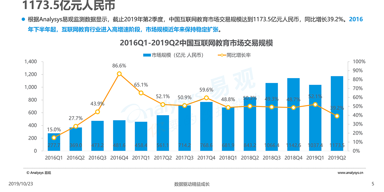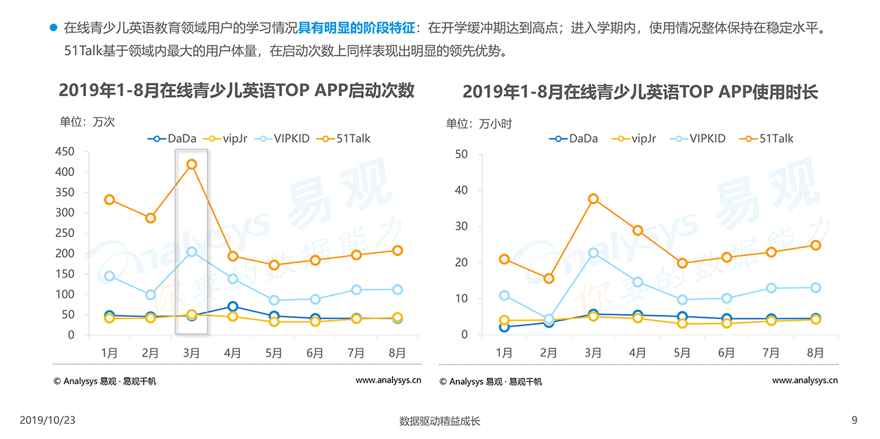 報告下載2019年10月23日,易觀發布了《中國互聯網青少兒英語教育行業洞察2019》的專題分析。青少兒英語教育行業在強需求驅動下保持著快速、穩定的增長,用戶流量加速向以51Talk為代表的頭部教育品牌集中。打造外教名師、引進正版教材、深耕課程體系……頭部廠商們圍繞各個維度積極鞏固競爭優勢,進入下半場的青少兒英語教育行業也呈現出更多新特點;未來,AI與大數據技術所驅動的自適應教育、市場下沉帶來的用戶紅利將成為行業新一輪增長的核心引擎。