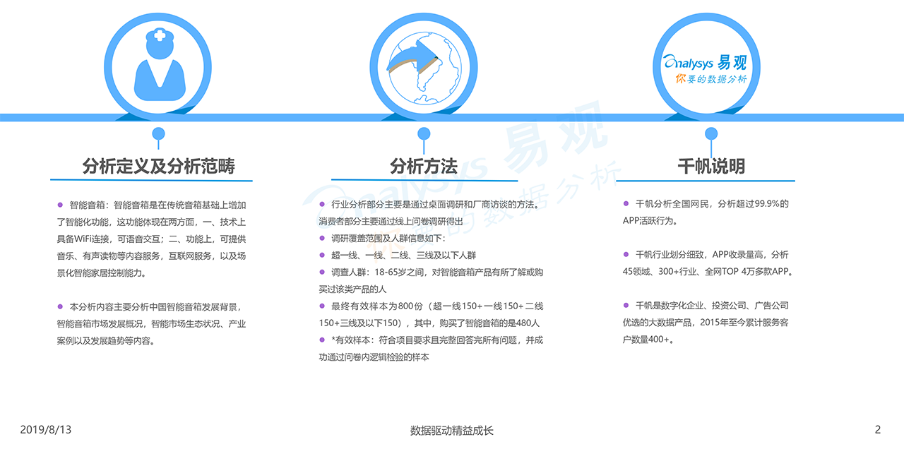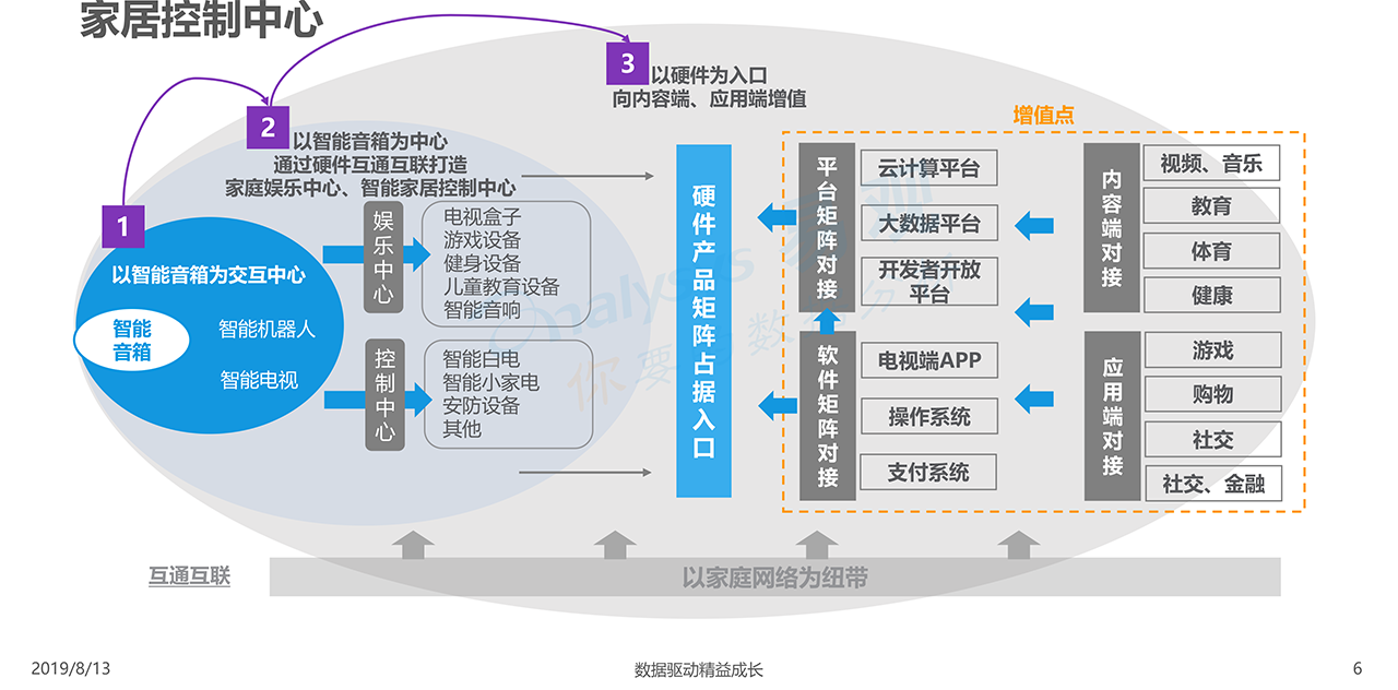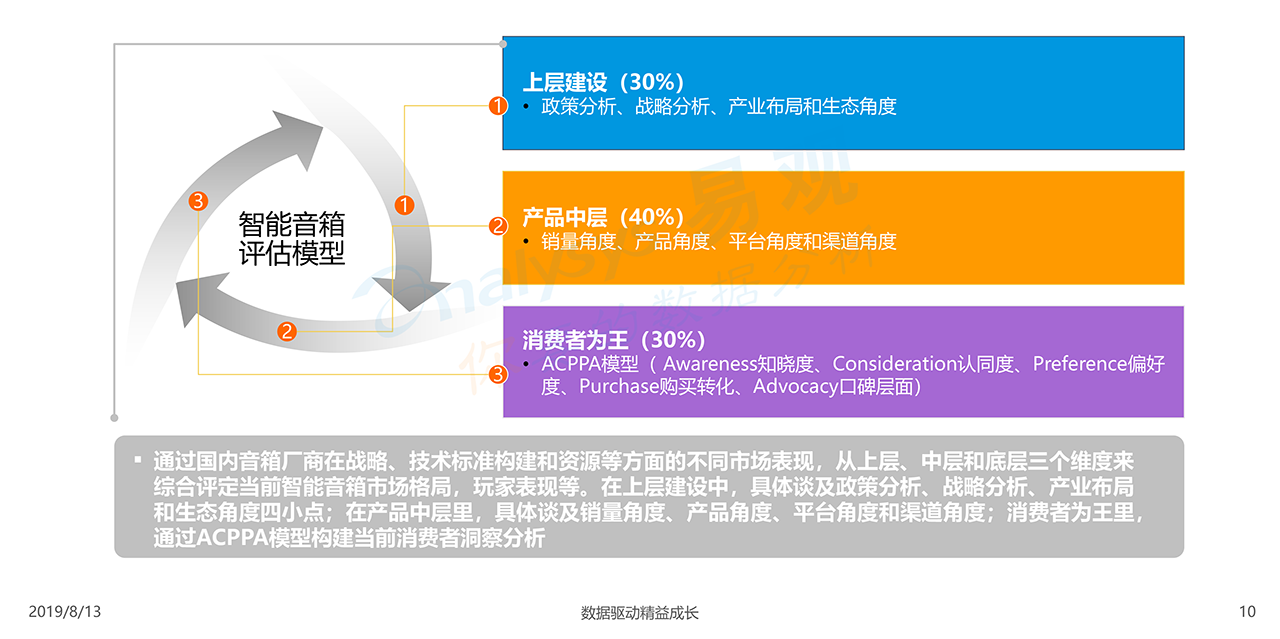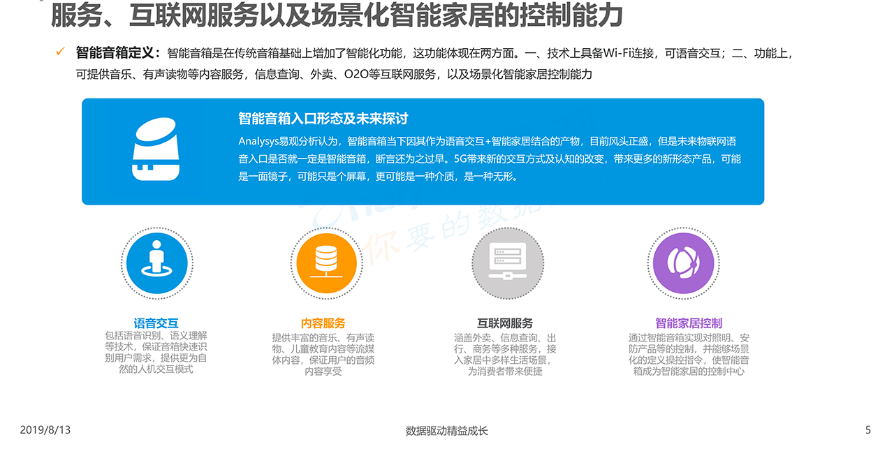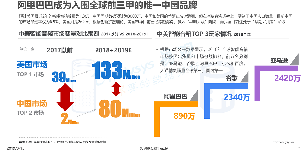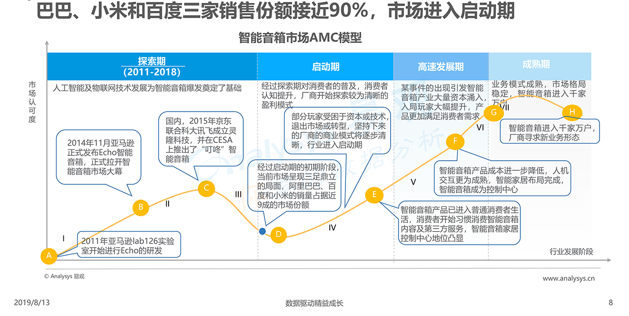 報告下載2019年8月13日,易觀發布了《中國智能音箱行業深度發展分析2019》的分析報告,智能音箱以其天然的語音交互優勢成為現階段智能家居控制中心。國內巨頭紛紛涉足智能音箱領域,目前阿里巴巴、小米和百度三家銷售份額接近90%,市場進入啟動期。智能音箱玩家都希望通過科技力量幫助人類更好發展。開放又閉環的大生態有助于企業更好的實現長期發展。