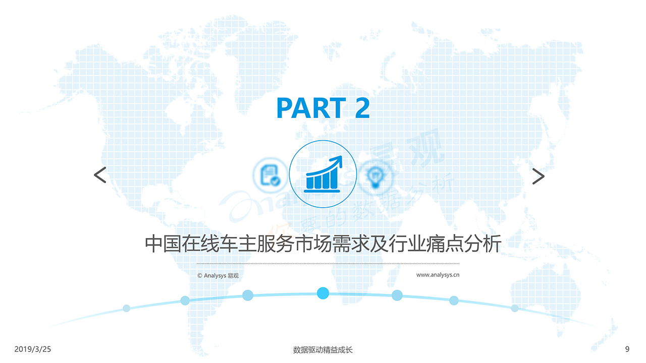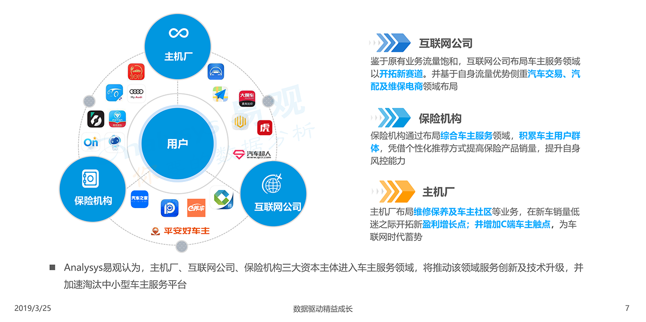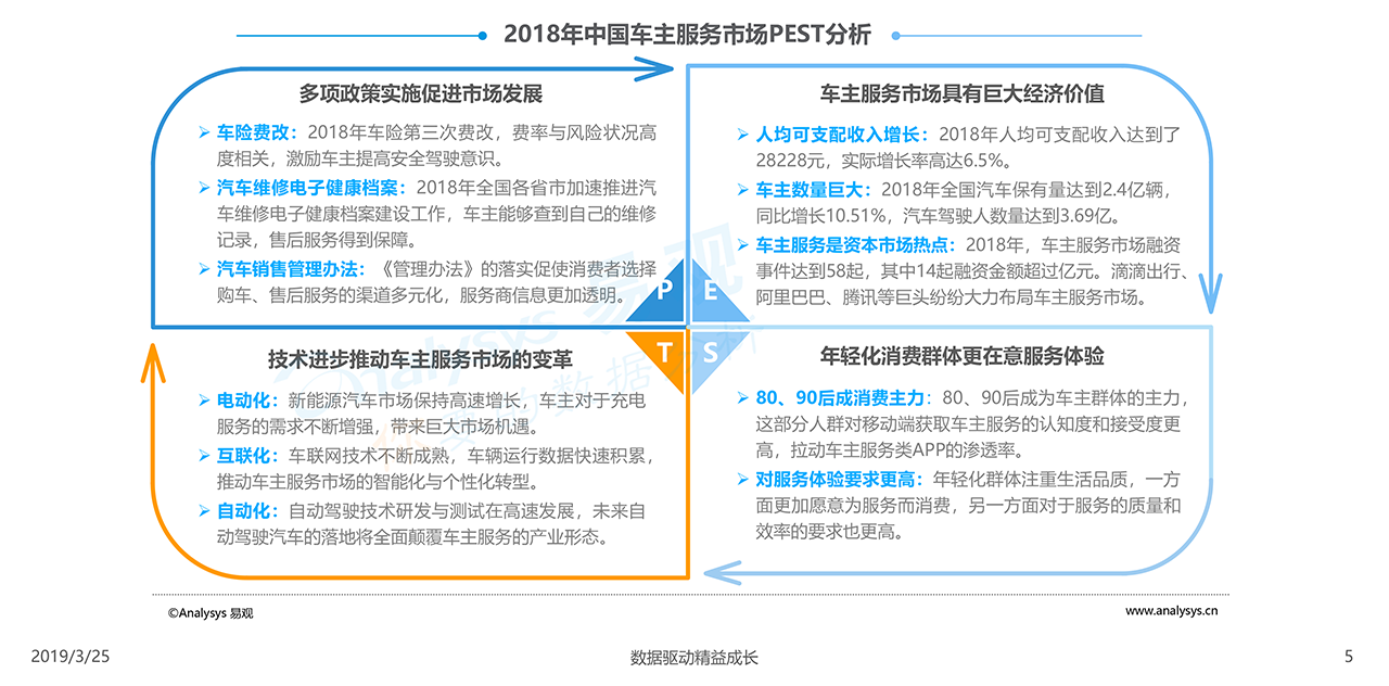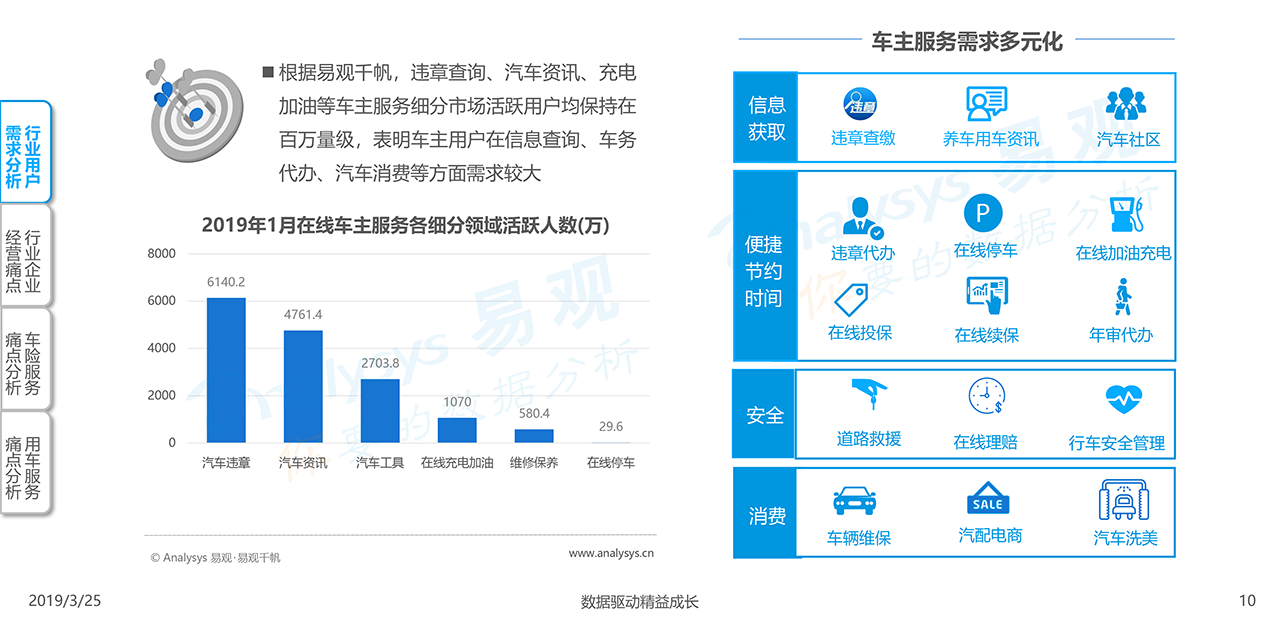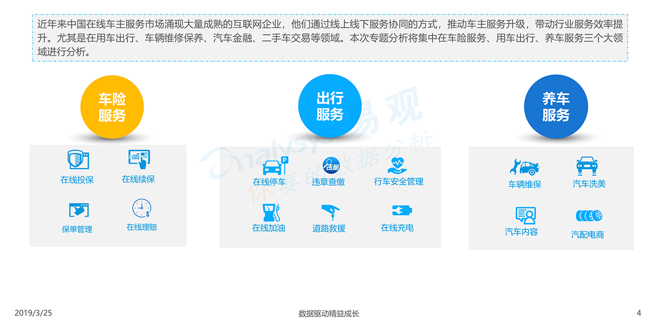 報告下載2019年3月22日,易觀發布了《2019年中國在線車主服務白皮書》。該分析指出目前我國車主服務行業仍存在信息不對稱、服務體驗差、價格不合理、時間成本高等痛點。而線上車主服務平臺通過線上與線下服務協同打通,為用戶提供更加便捷、優質的服務。本分析將從車險服務、用車服務、養車服務三個細分維度出發,首先指出車主服務市場需求變化、競爭格局、及行業內用戶及企業存在的普遍痛點,并提出相關解決方案,并在最后對行業發展趨勢做出展望。