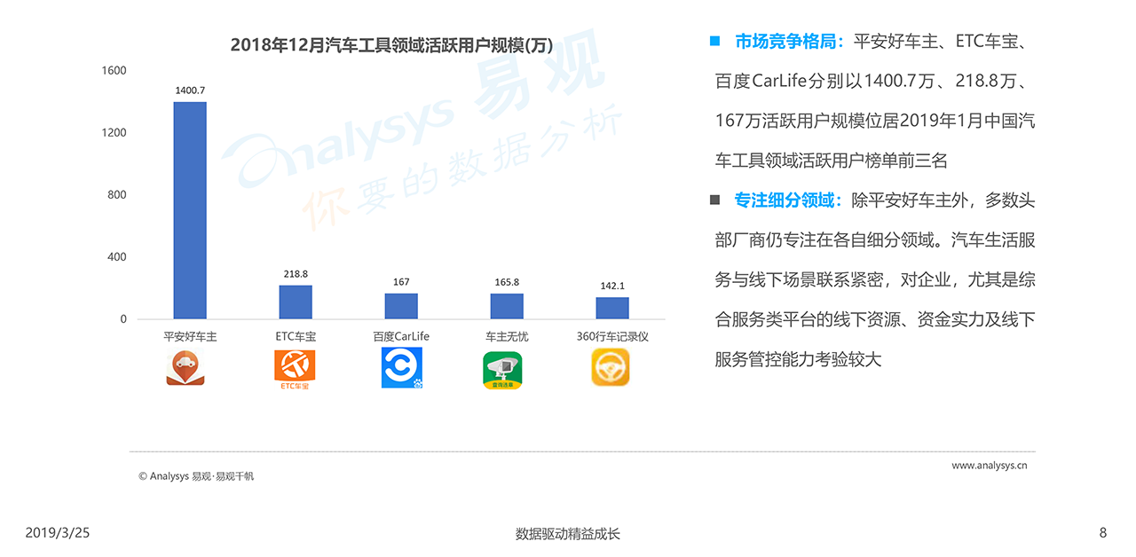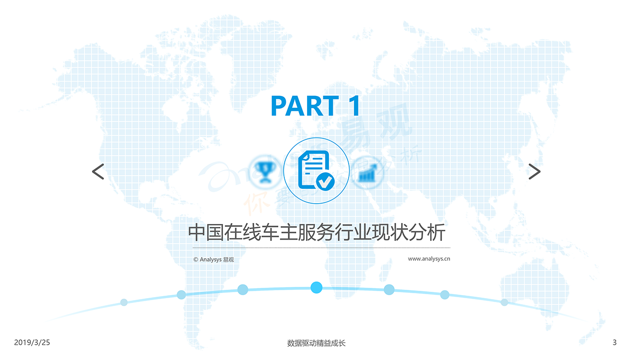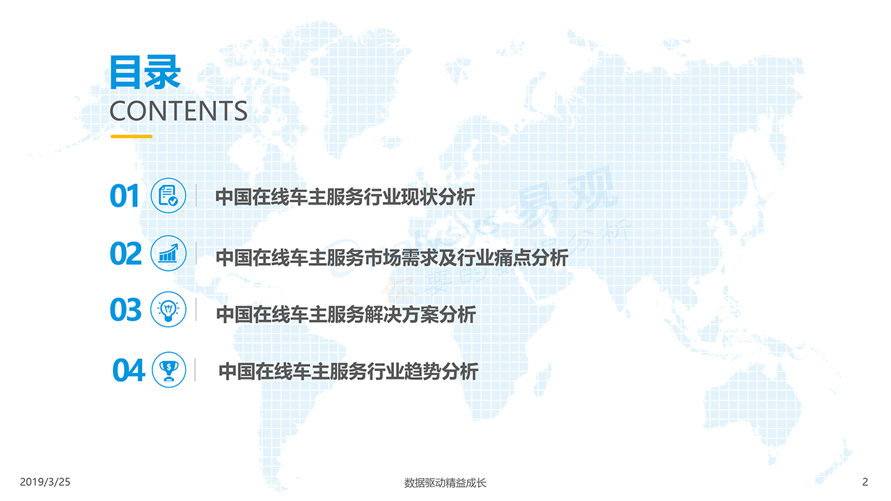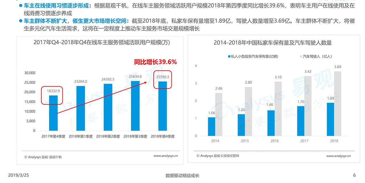 報告下載2019年3月22日,易觀發布了《2019年中國在線車主服務白皮書》。該分析指出目前我國車主服務行業仍存在信息不對稱、服務體驗差、價格不合理、時間成本高等痛點。而線上車主服務平臺通過線上與線下服務協同打通,為用戶提供更加便捷、優質的服務。本分析將從車險服務、用車服務、養車服務三個細分維度出發,首先指出車主服務市場需求變化、競爭格局、及行業內用戶及企業存在的普遍痛點,并提出相關解決方案,并在最后對行業發展趨勢做出展望。