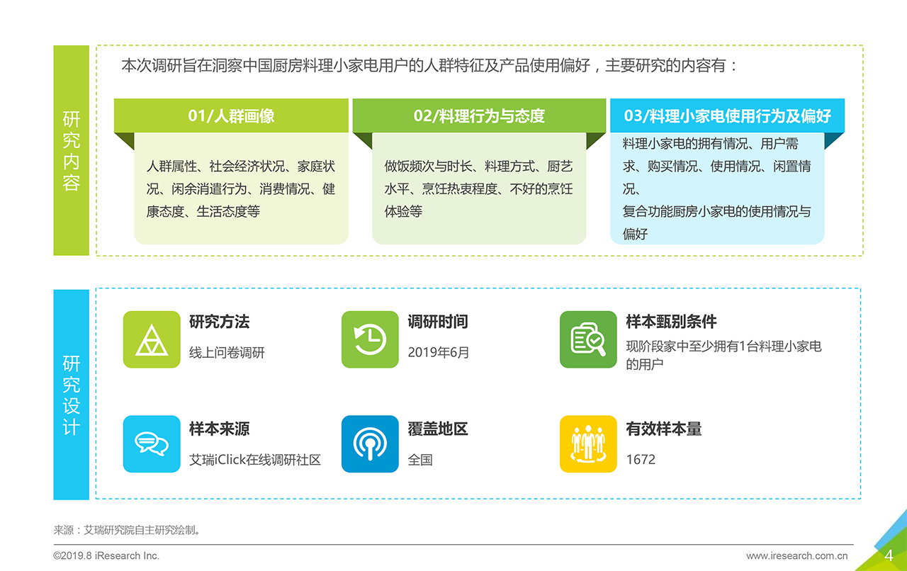 報告下載《2019年中國廚房料理小家電行業用戶洞察及趨勢報告》使用調研社區對中國廚房小家電用戶進行線上問卷調研,了解其人群畫像、烹飪行為及態度、廚房料理小家電使用行為及態度,并展望了行業未來可能的發展趨勢。